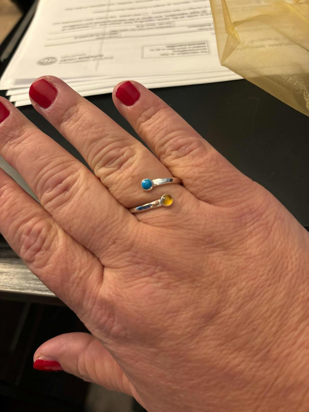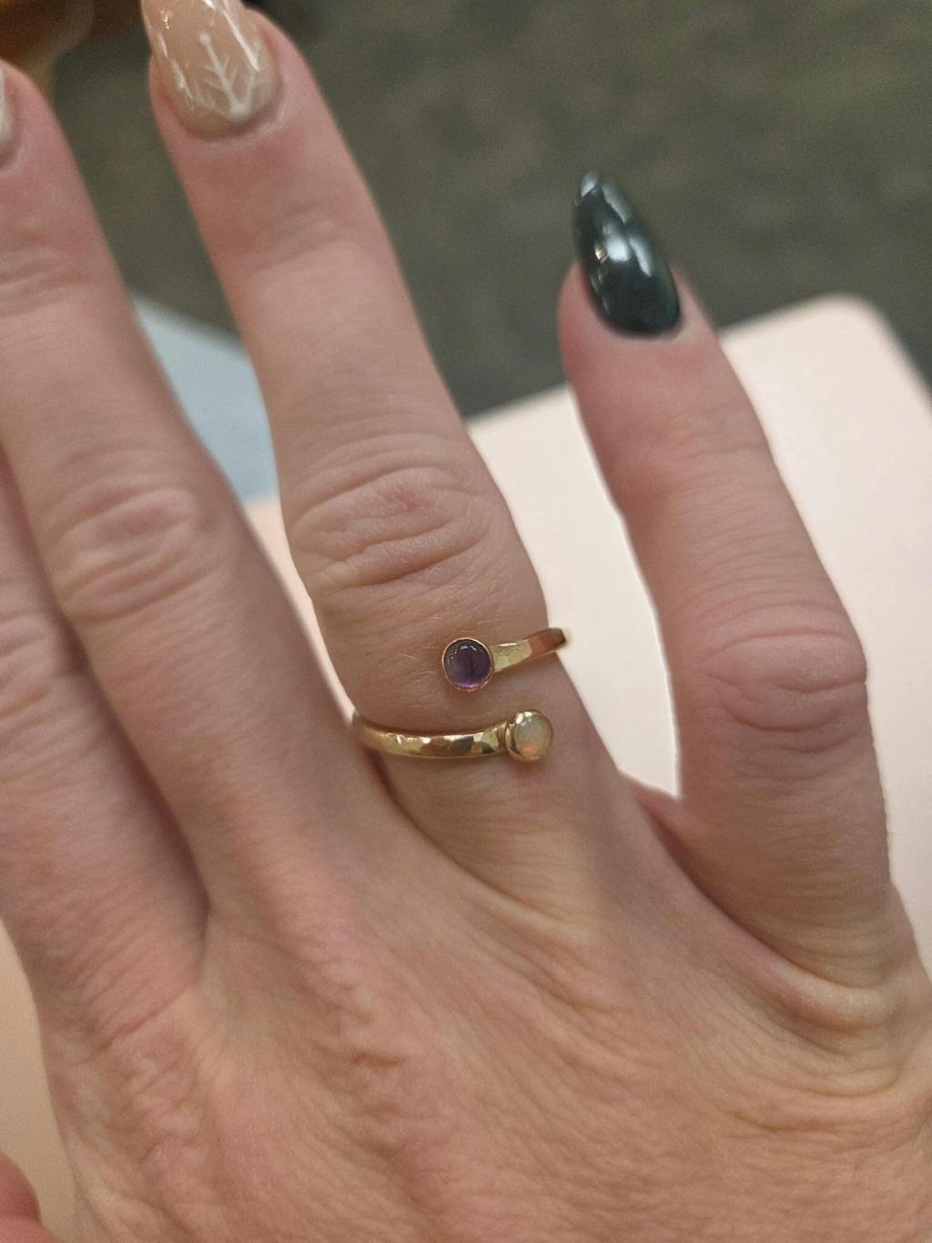 We delicately handcraft each ring from 14-karat Yellow Gold filled or .925 Sterling Silver. The hammered 12GA band that stretches between these stones symbolizes the powerful path of love that you have walked together.