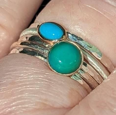 This listing features ONE Turquoise ring in pure .925 sterling silver, available in Round, Oval, Small, or Petite sizes. If you want to create a stack, add each ring to cart individually. Please note that genuine Turquoise exhibits natural variations in matrixing and color, ensuring that each piece of our ethically and sustainably sourced from Arizona, each Genuine Kingman Turquoise Ring is truly one-of-a-kind.