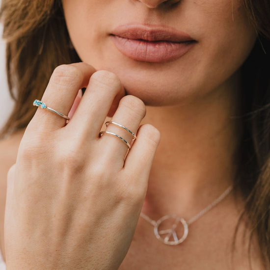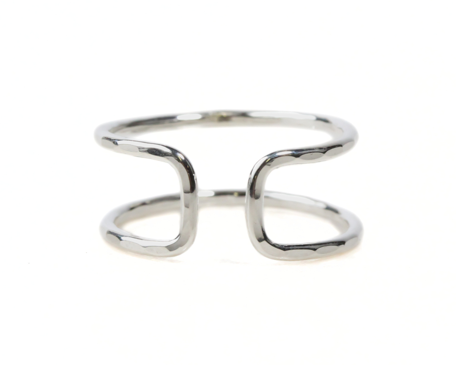 Handcrafted from 16G round wire in sterling silver or 14K yellow gold filled, this open-back ring features two parallel bands joined in harmony. The traditional hammered texture catches the light softly, adding depth and movement to the sleek 1/4" wide design.