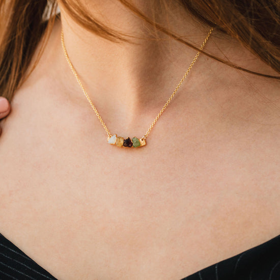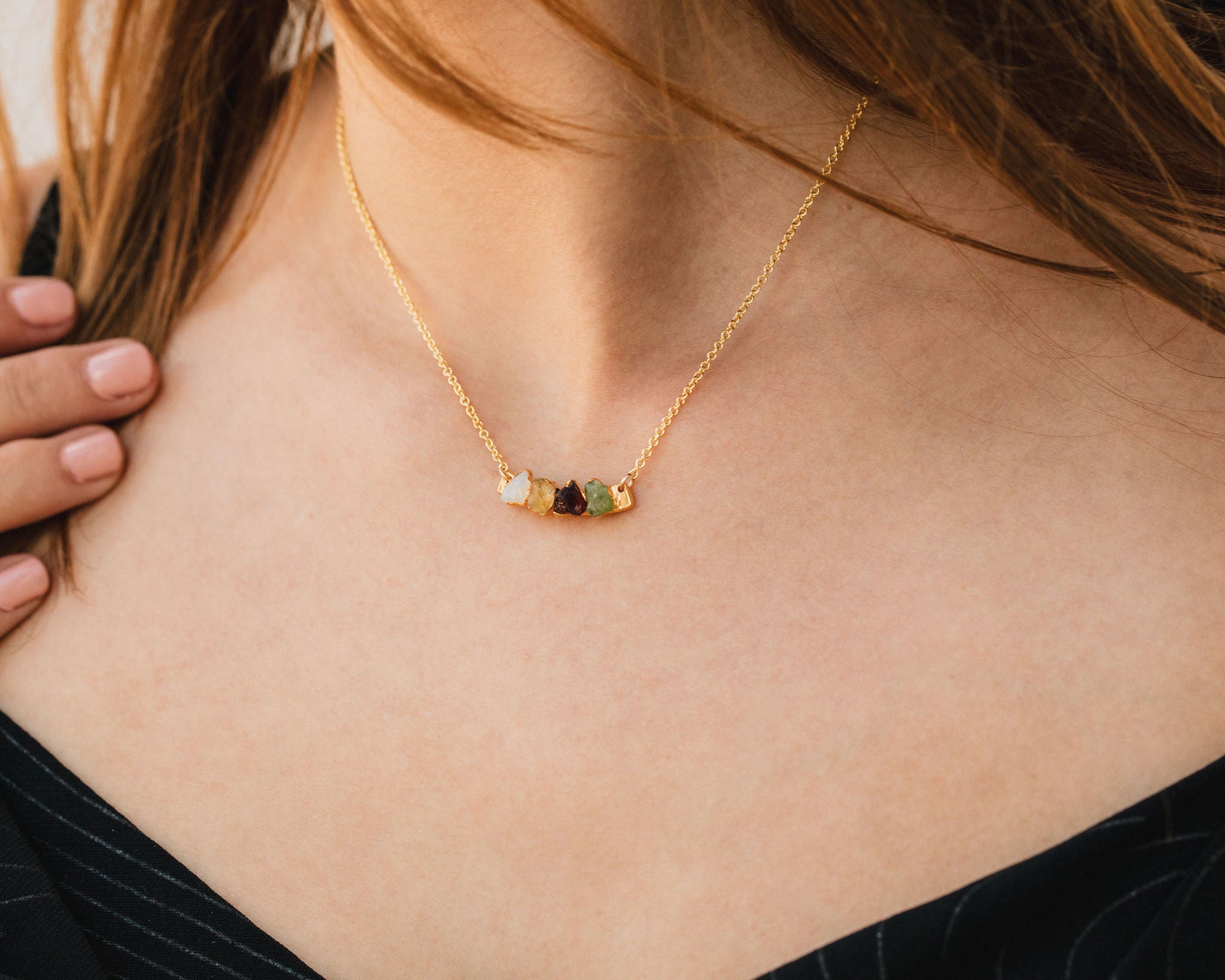 Immerse yourself in the enchanting allure of our Birthstone Necklaces, featuring genuine, organically shaped gemstones delicately set in radiant Copper, 14k Gold Plate, 18k Rose Gold Plate, or .999 fine Silver Plate. Each piece is a unique, personalized creation, making it the perfect customized gift for Mom! Choose birthstones that embody the essence of your loved ones.
