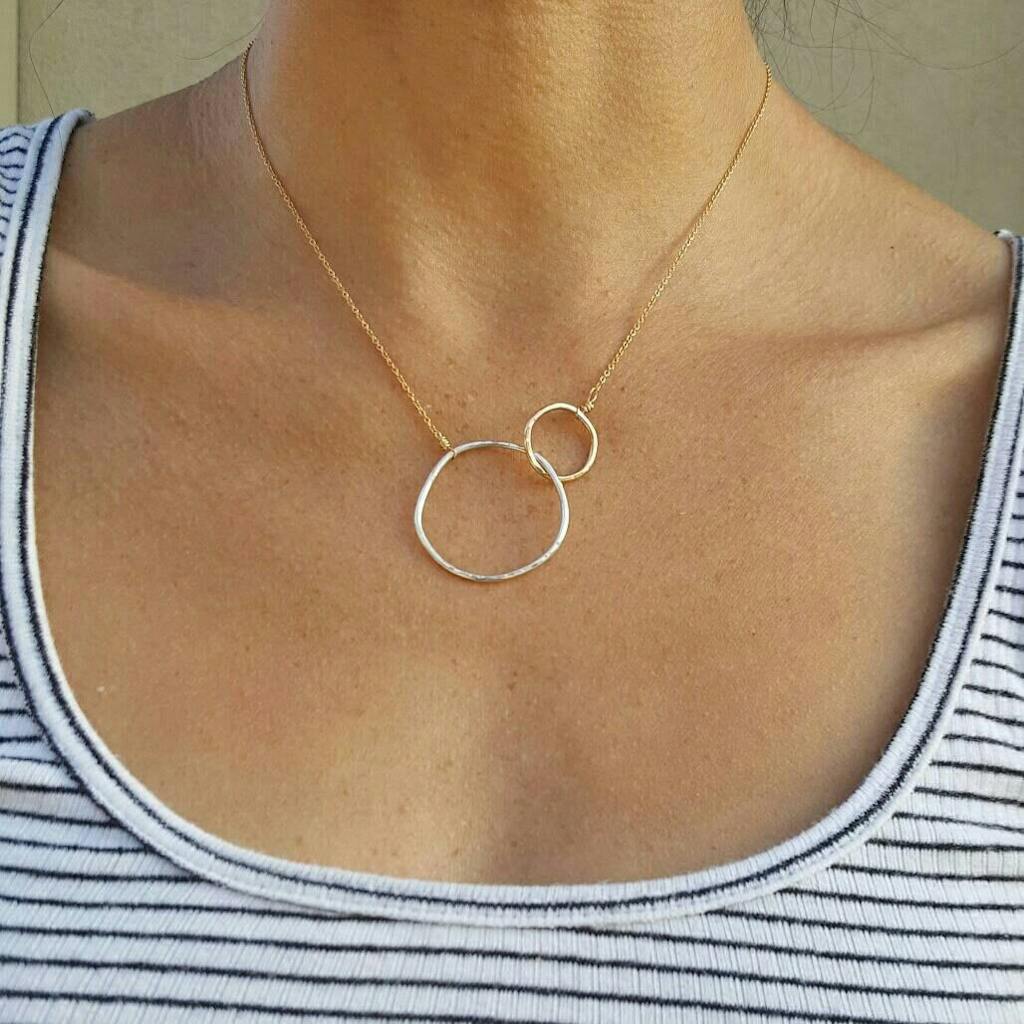 I really love this necklace. It is crafted so beautifully. I like the mixed metals and that the circles are not perfect. I do wish I had ordered a larger chain size. The 18' chain would be a better fit for me than the 16', which can be a bit snug.