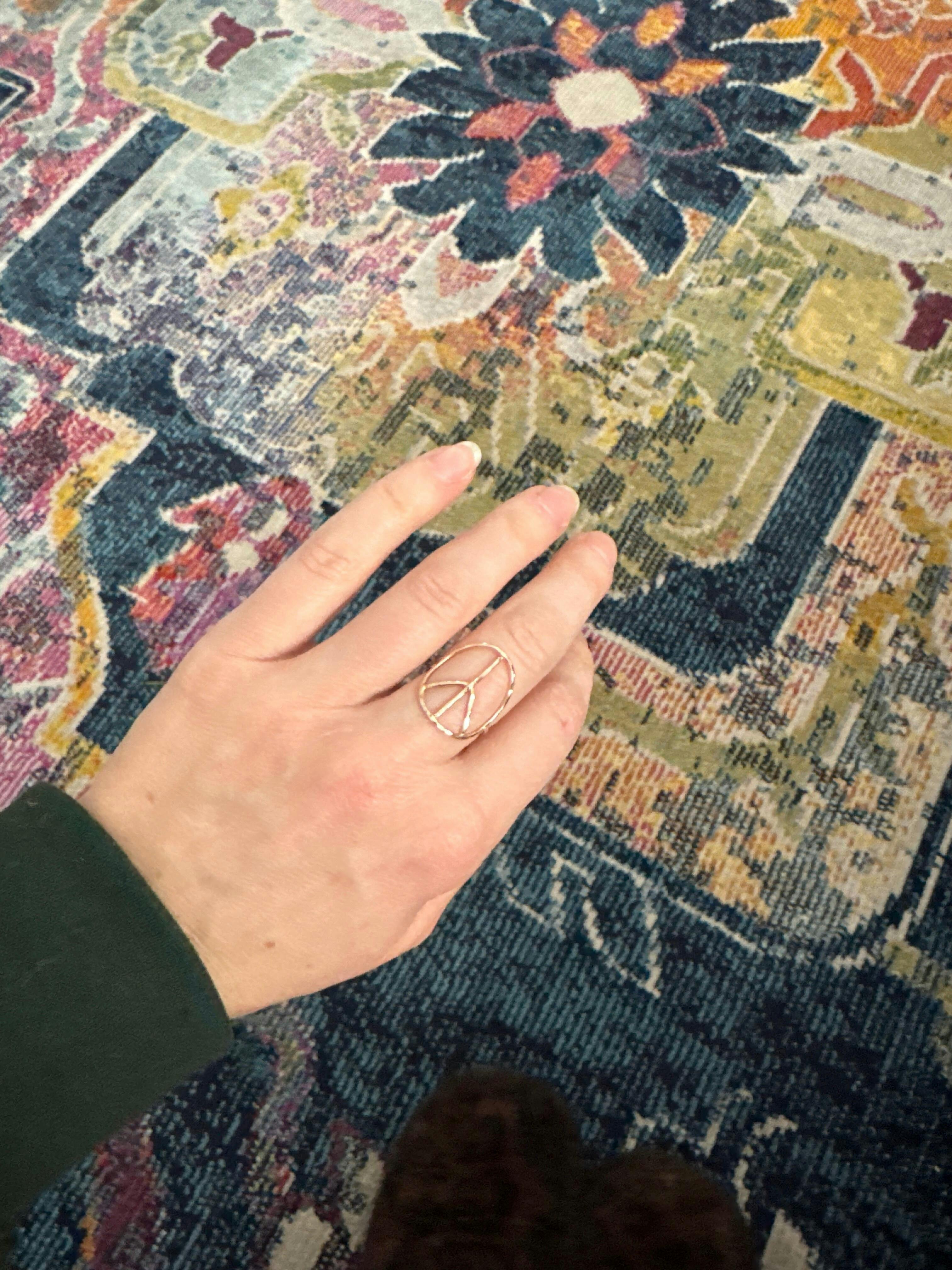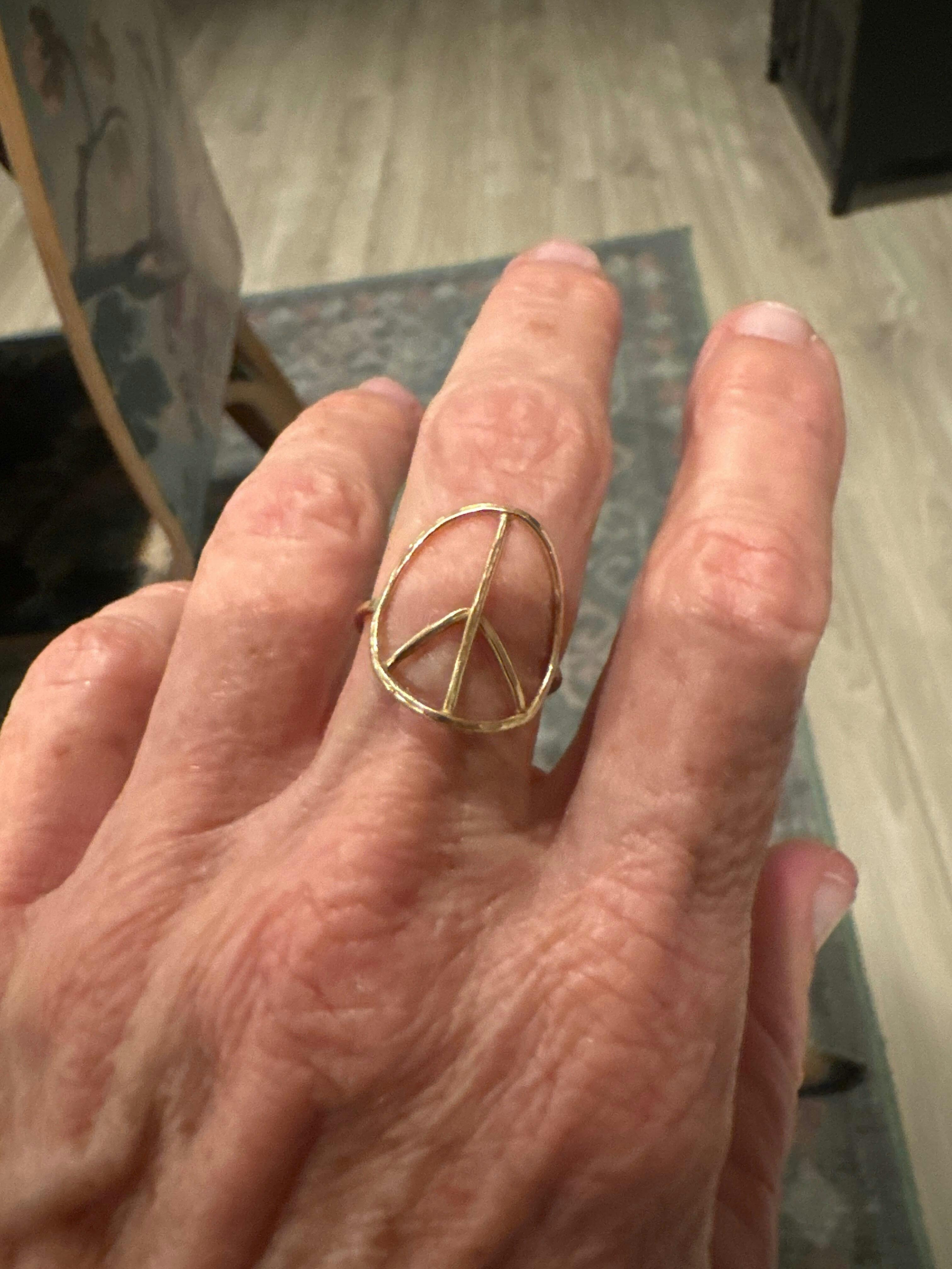This is the perfect ring for me. The base of my fingers is smaller than my knuckle now, so I don’t wear rings with any sort of raised gems or design because it spins around and drives me crazy. This ring is delicate while making a big statement and as a child of the 60s, peace and love have always been my favorite symbols. I adore it. If it came in 14k I’d spend the money to have it last forever.