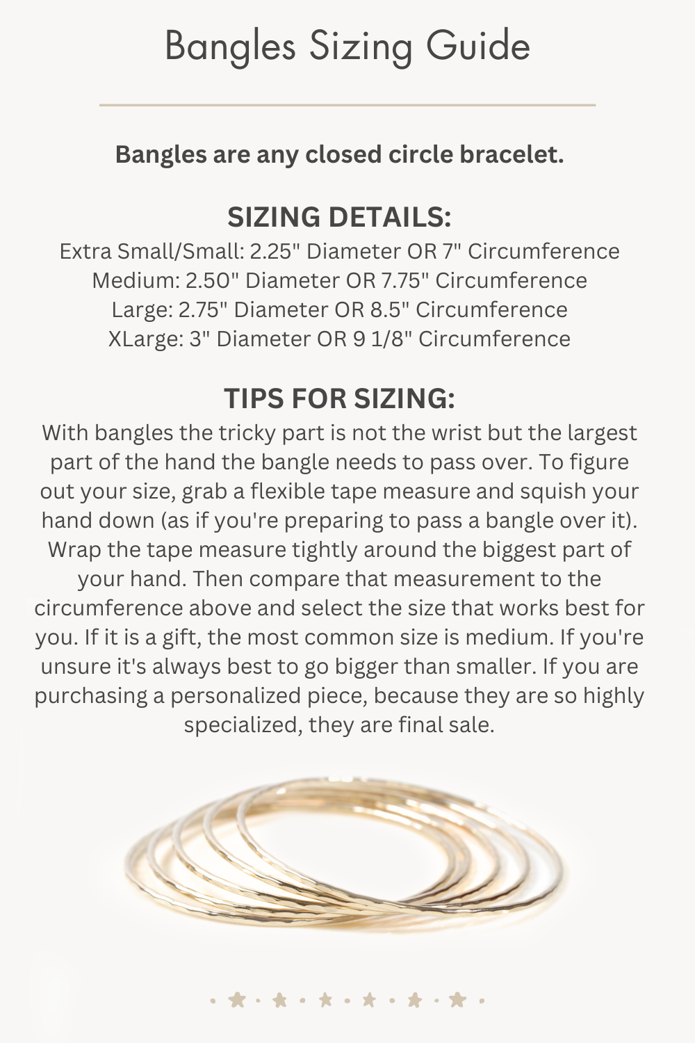 With bangles the tricky part is not the wrist but the largest part of the hand the bangle needs to pass over. To figure out your size, grab a flexible tape measure and squish your hand down (as if you're preparing to pass a bangle over it). Wrap the tape measure tightly around the biggest part of your hand. Then compare that measurement to the circumference above and select the size that works best for you. If it is a gift, the most common size is medium. If you're unsure it's always best to go bigger than smaller. If you are purchasing a personalized piece, because they are so highly specialized, they are final sale.