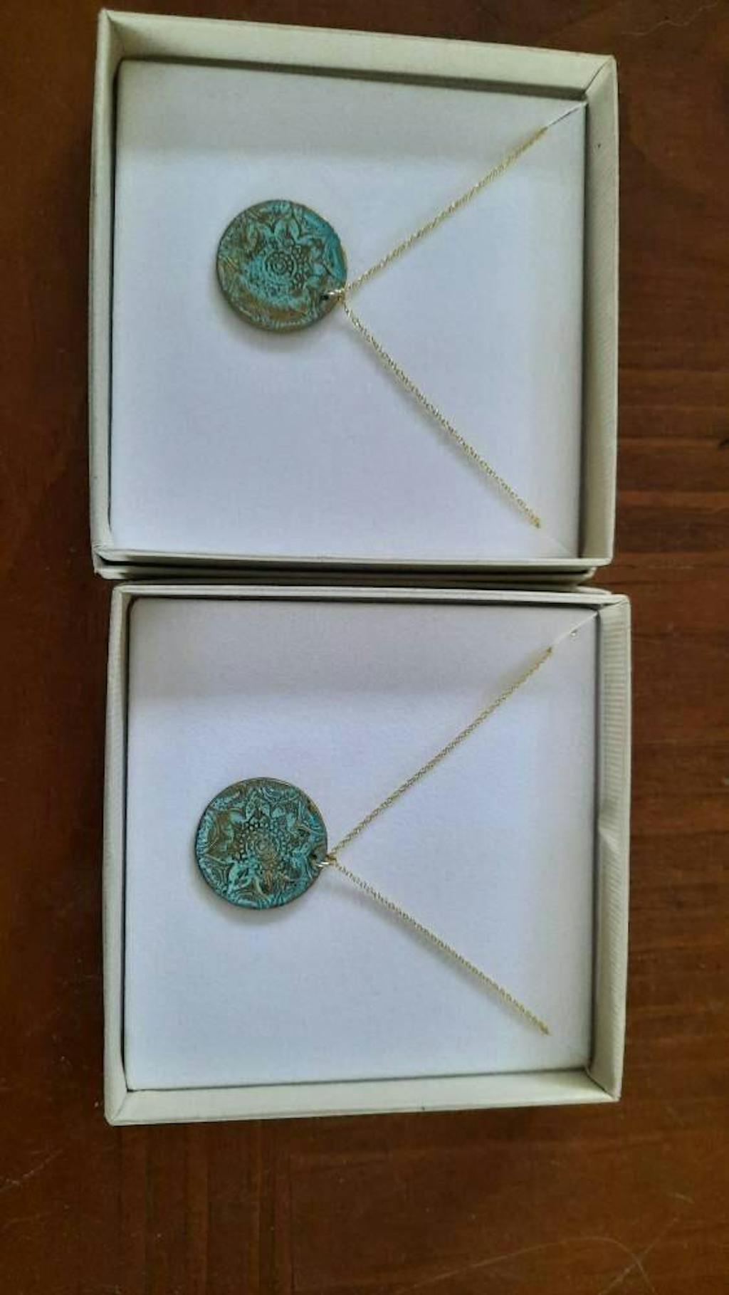 Our Lotus Mandala Necklace embodies the essence of resilience and purity. Crafted on a 1” Nu Gold disc, this pendant is available adorned with our enchanting mint patina finish. Suspended elegantly from a 14K yellow gold-filled chain, it beautifully captures the symbolism of the lotus flower.