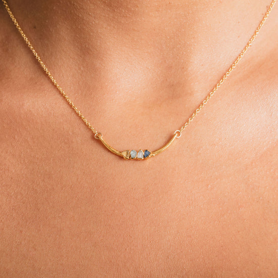 Additional benefits of this gemstone crescent necklace include its natural texture and variation, ensuring no two necklaces are exactly alike. Copper offers a warm tone that may deepen over time, while gold and rose gold plated finishes provide a soft glow. Fine silver plated pieces bring a bright, neutral finish to the design. This handcrafted birthstone gift is thoughtfully designed to hold deep personal significance while remaining simple, wearable, and easy to pair with other pieces.