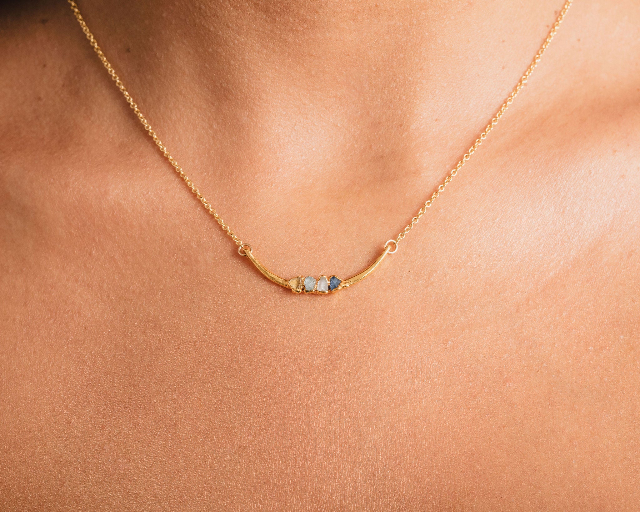 The Mini Mother’s Birthstone Crescent Necklace is a beautifully handcrafted mothers birthstone necklace designed to celebrate the unique bond between a mother and her loved ones through meaningful birthstones. This delicate gemstone pendant features 2 to 5 uncut, natural raw stones arranged in a subtle crescent shape, offering a refined, everyday wearable look. Made by Amy Waltz Designs, this custom gemstone jewelry combines personal meaning with a soft, minimal design, creating a lasting connection to family. The necklace is available in copper, 14 karat gold plated, 18 karat rose gold plated, or fine silver plated metals, each with a palladium barrier applied before plating to support durability and a lasting finish.