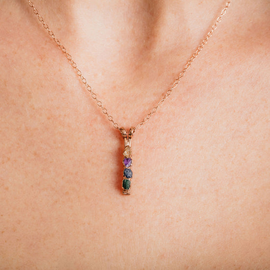This personalized mom gift is handcrafted by skilled artisans who carefully select each gemstone for its unique texture and color variation. The vertical silhouette of this mother's birthstone necklace offers a clean, elongated look that feels both modern and timeless, making it ideal for layering or wearing alone as a delicate, understated piece. For July, we use pink tourmaline in place of ruby due to electroforming process compatibility, while April’s Herkimer diamond stands in for the traditional diamond, ensuring every stone meets our quality standards. Because each piece is made from a wide variety of natural stones, we ask that you provide clear preferences in the personalization box so we can bring your vision to life. If details are not included, our artisans will thoughtfully design your necklace using their artistic discretion.