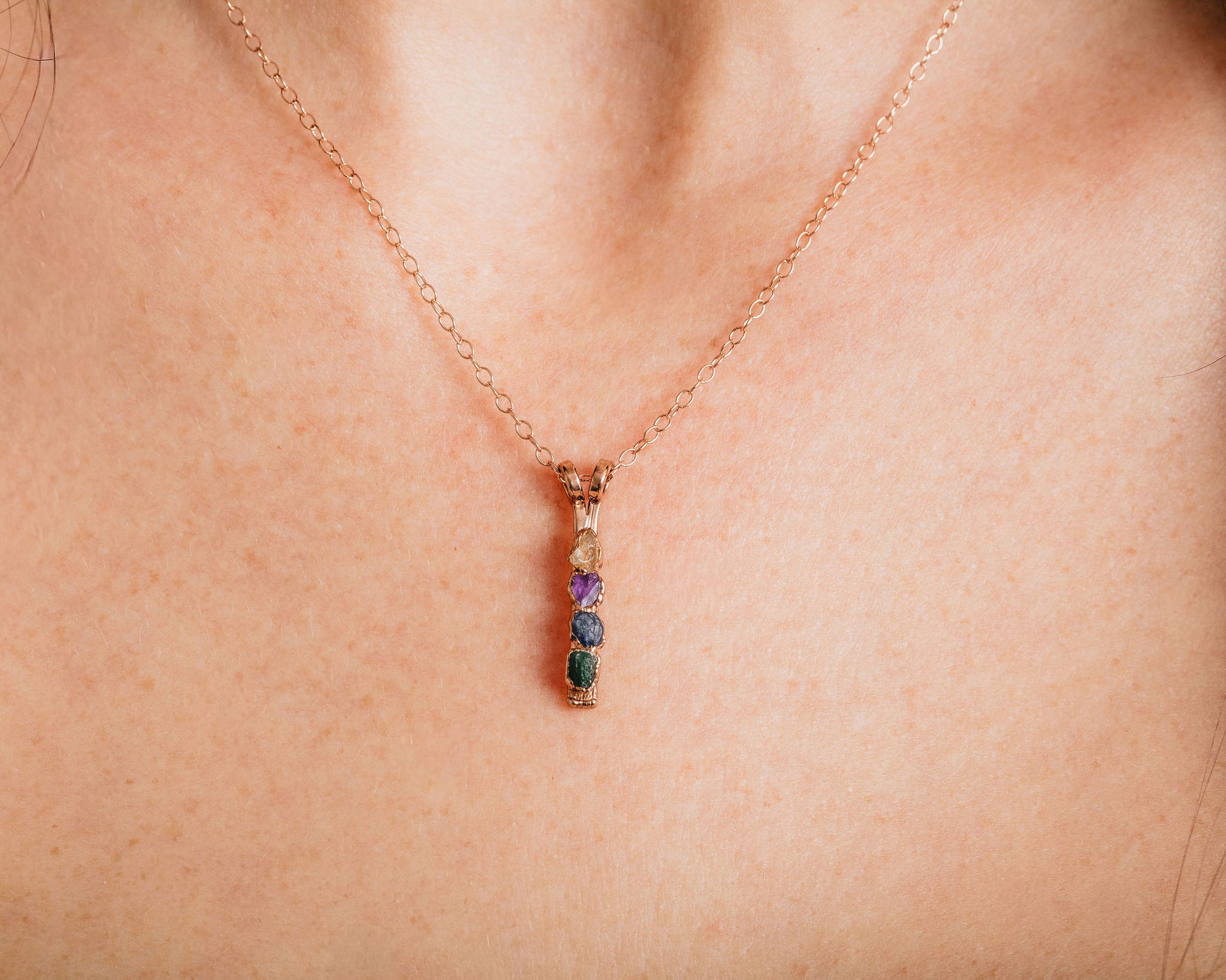 Additional benefits of this gemstone legacy necklace include its natural texture and variation, ensuring no two necklaces are exactly alike. Copper offers a warm tone that may deepen over time, while gold and rose gold plated finishes provide a soft glow. Fine silver plated pieces bring a bright, neutral finish to the design. This handcrafted birthstone gift is thoughtfully designed to hold deep personal significance while remaining simple, wearable, and easy to pair with other pieces.