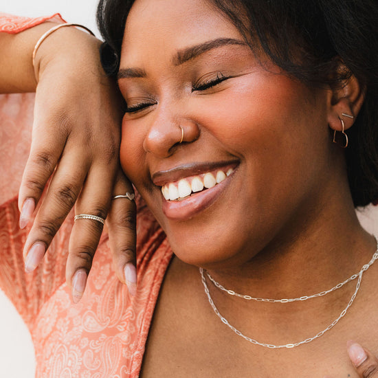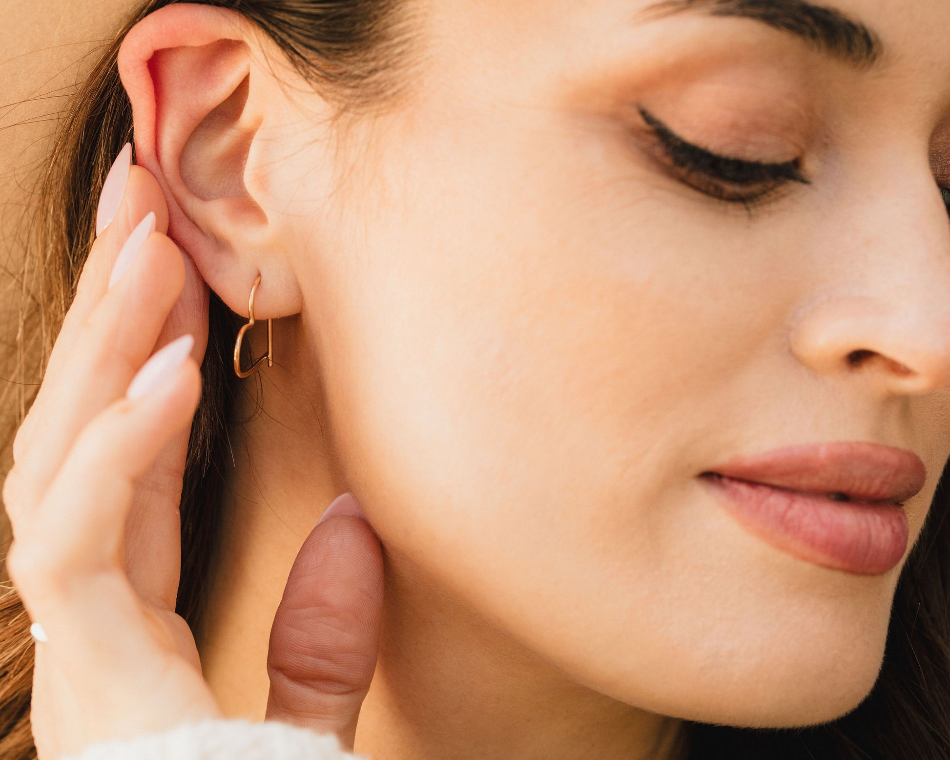 Measuring 3/4 inch wide x 3/4 inch high and made from 18 GA fine metal wire, they are offered in all three of our fine metal selections: .925 Sterling Silver, 14kt Yellow Gold Filled, and 14kt Rose Gold Filled. Thoughtful, subtle, and full of heart, these mini hoops are a meaningful staple you will reach for again and again.