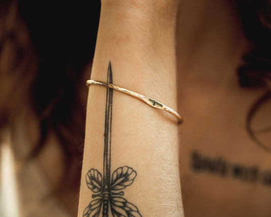 With bangles the tricky part is not the wrist but the largest part of the hand the bangle needs to pass over. To figure out your size, grab a flexible tape measure and squish your hand down (as if you're preparing to pass a bangle over it). Wrap the tape measure tightly around the biggest part of your hand. Then compare that measurement to the circumference above and select the size that works best for you. If it is a gift, the most common size is medium. If you're unsure it's always best to go bigger than smaller. If you are purchasing a personalized piece, because they are so highly specialized, they are final sale.