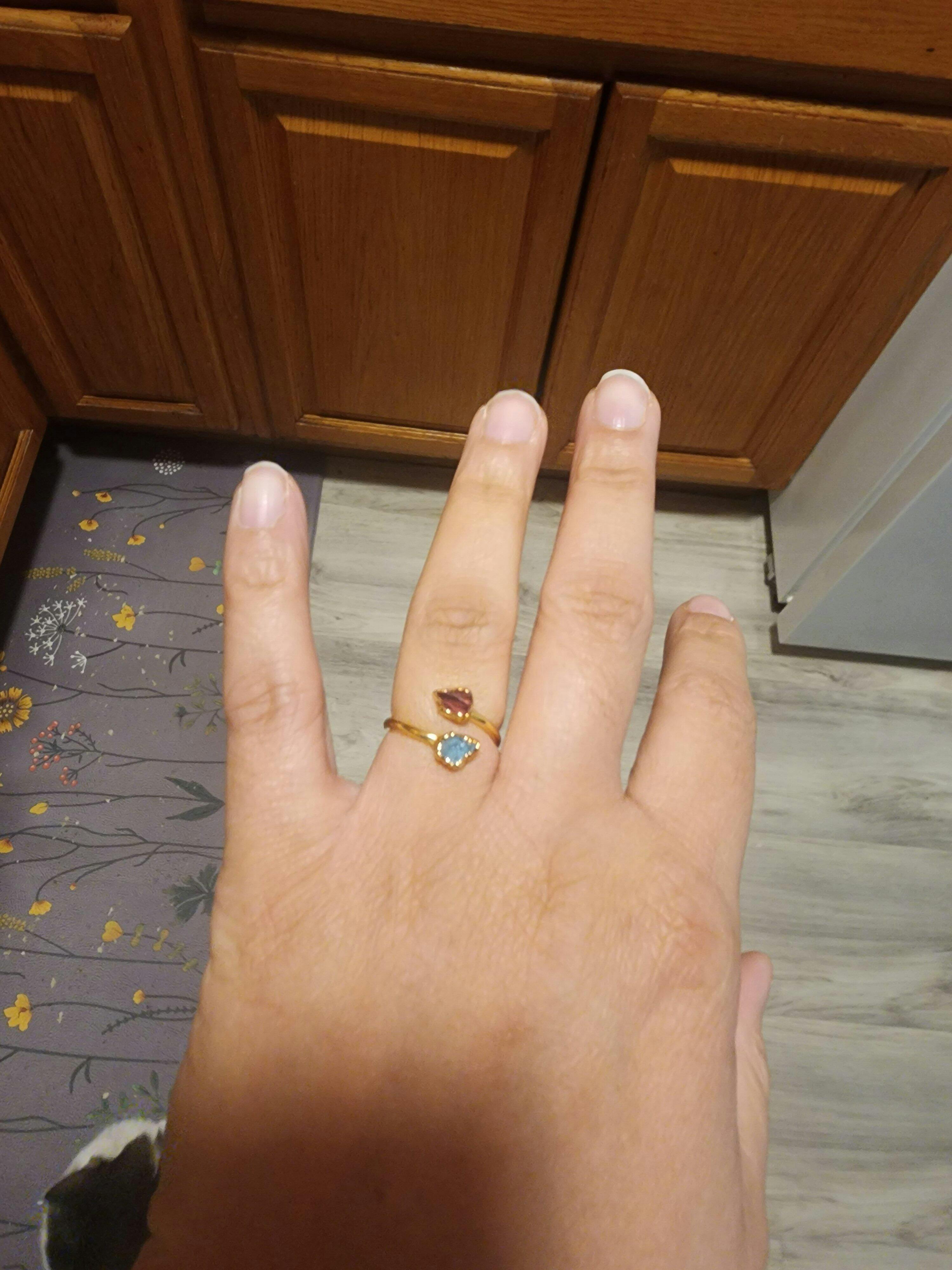 These raw gemstones are uncut and unpolished, showcasing their natural charm. For our copper, 14k gold plate, and 18k rose gold plate options, rings start with a copper band, electroformed and given a flash palladium coating before final plating. Our new upgrades feature a .925 sterling silver band, 14k gold-filled band or 14k rose gold filled band. We seal the exposed band in these upgrades to prevent copper from forming on it, allowing bonding only around the stones for secure attachment. The entire ring then receives a flash palladium coating followed by a plating in fine silver, 14k gold or 18k rose gold. Resizing is not possible, so please refer to our Sizing Guide for an accurate fit.