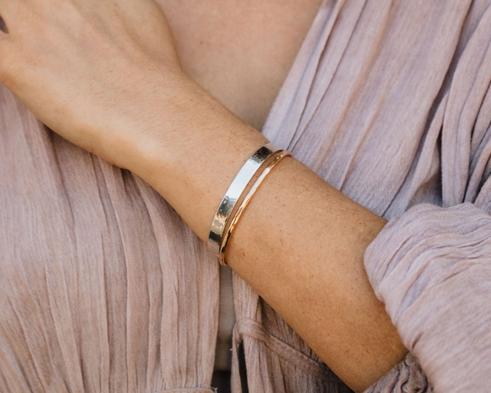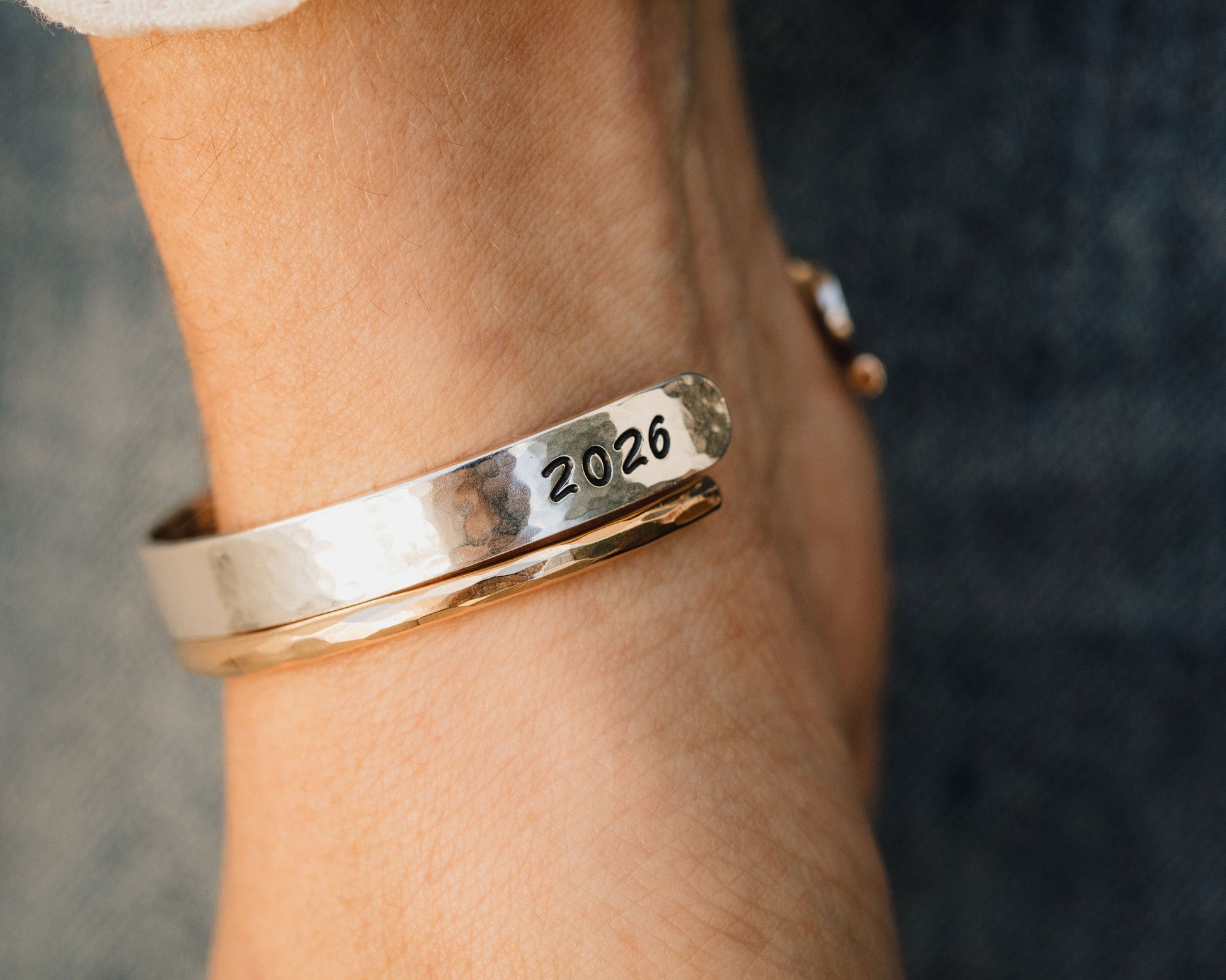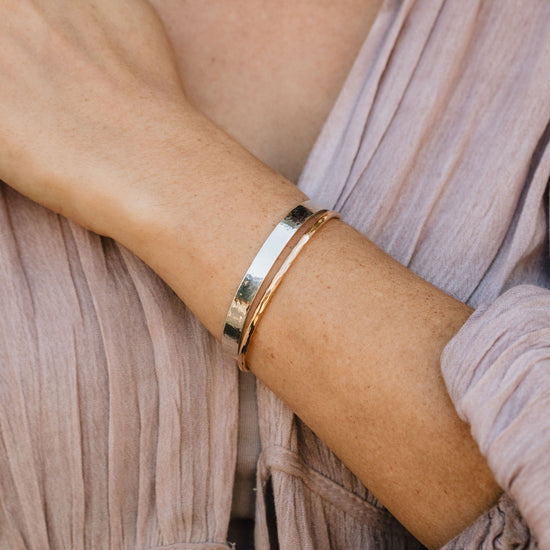 Handcrafted by our skilled artisans in Northern California, the slim 1/4 inch cuff carries the empowering expression “She Believed She Could So She Did” in our Willow Script font along the inside. The outer edges can be personalized with a name on one side and a meaningful year on the other, creating a piece that feels deeply personal. It is paired with a separate skinny stacking cuff that complements the main piece with a simple, balanced look. Both cuffs feature our signature hammered texture, catching the light in a natural, beautiful way.