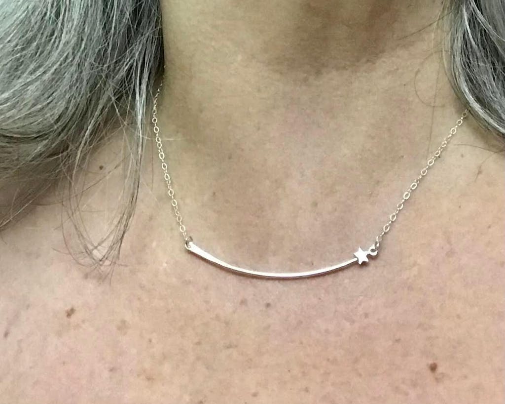 The fine metal 2.25" bar on this hand forged shooting star necklace has a simple bend to it and a very delicate texture to reflect the light. The sterling or yellow gold filled star attaches to the bar and is secured to a simple 1.5 mm chain. It is delicate, incredibly comfortable and easy to wear with any ensemble. Anyone looking to commemorate an accomplishment or simply in need of divine inspiration will find this piece a perfect fit.