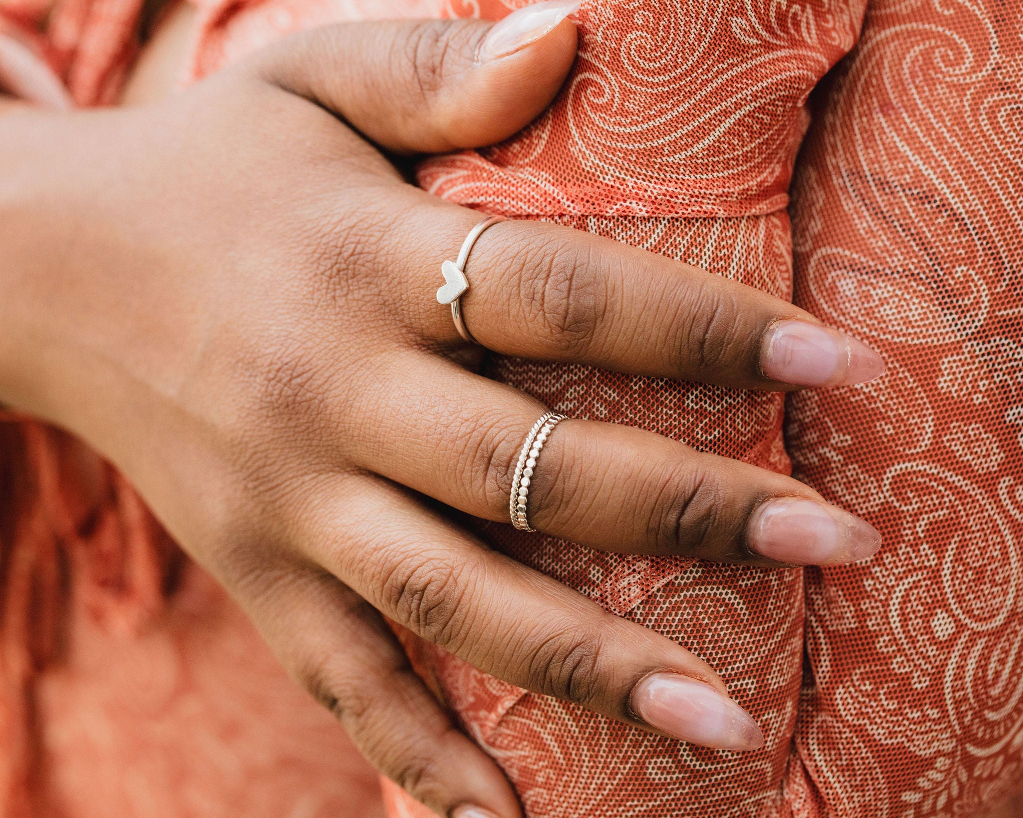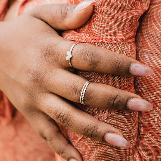 Each ring is thoughtfully handcrafted by our cherished artisans in Chico using 16 gauge wire. Offered in three intentional metal combinations, all sterling silver, a 14k gold filled band with a sterling silver heart, or a 14k rose gold band with a sterling silver heart. The solid heart sits as a quiet focal point, designed to be worn daily, stacked with intention, or worn alone as a personal statement.