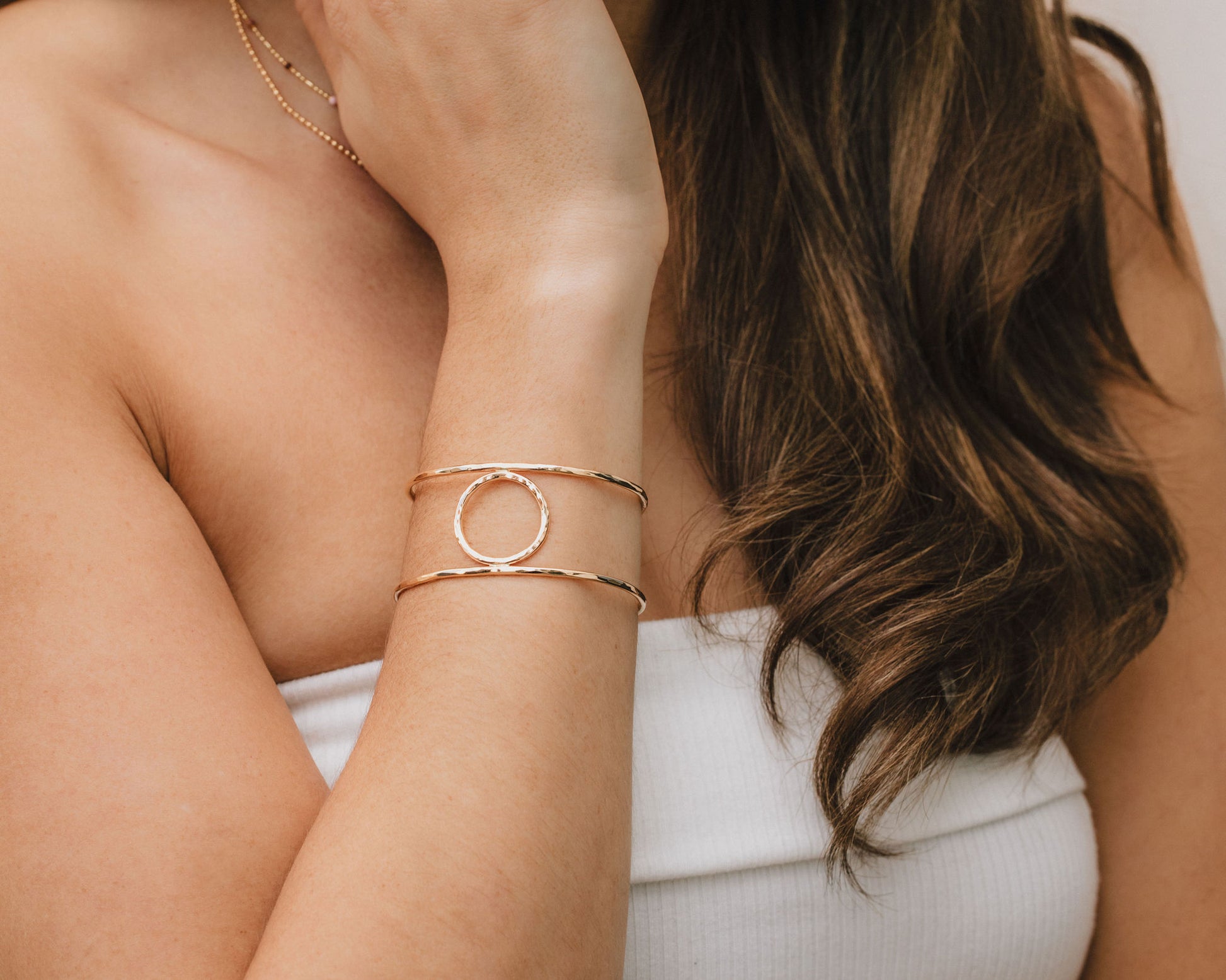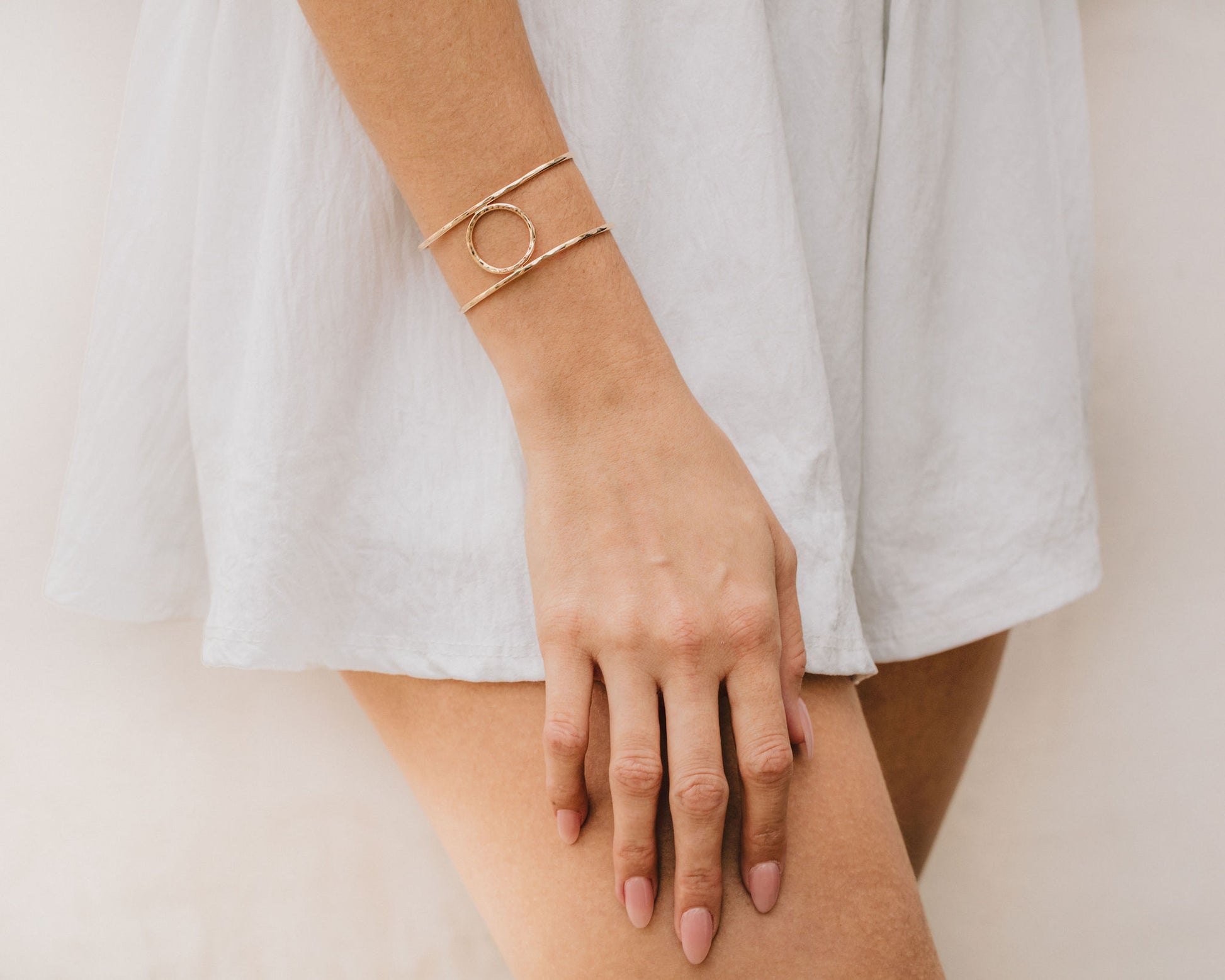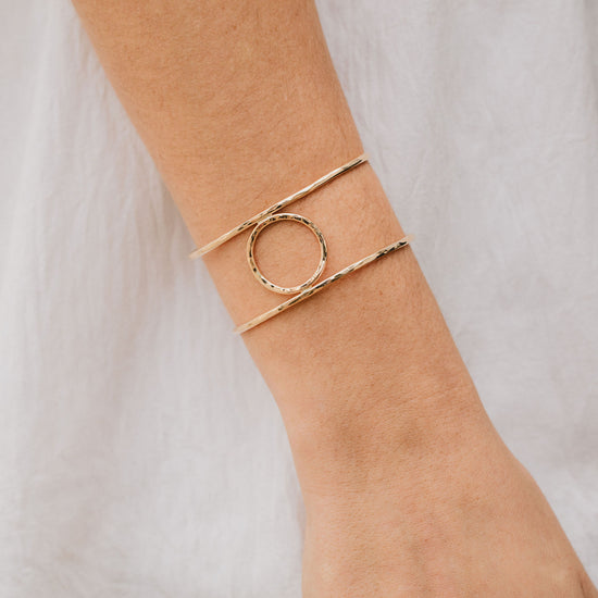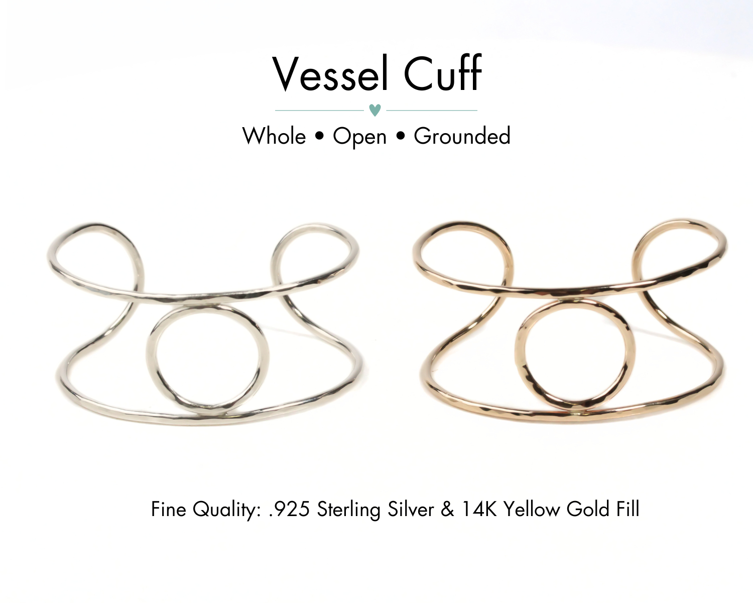 This open circle cuff is handcrafted from 12G round wire in your choice of sterling silver or 14K yellow gold filled and finished with our traditional faceted texture for a soft, light-catching shimmer. Slightly under 1" wide, the Vessel Cuff embodies wholeness, protection, and flow and serves as a reminder to stay present and receptive to life’s rhythm.