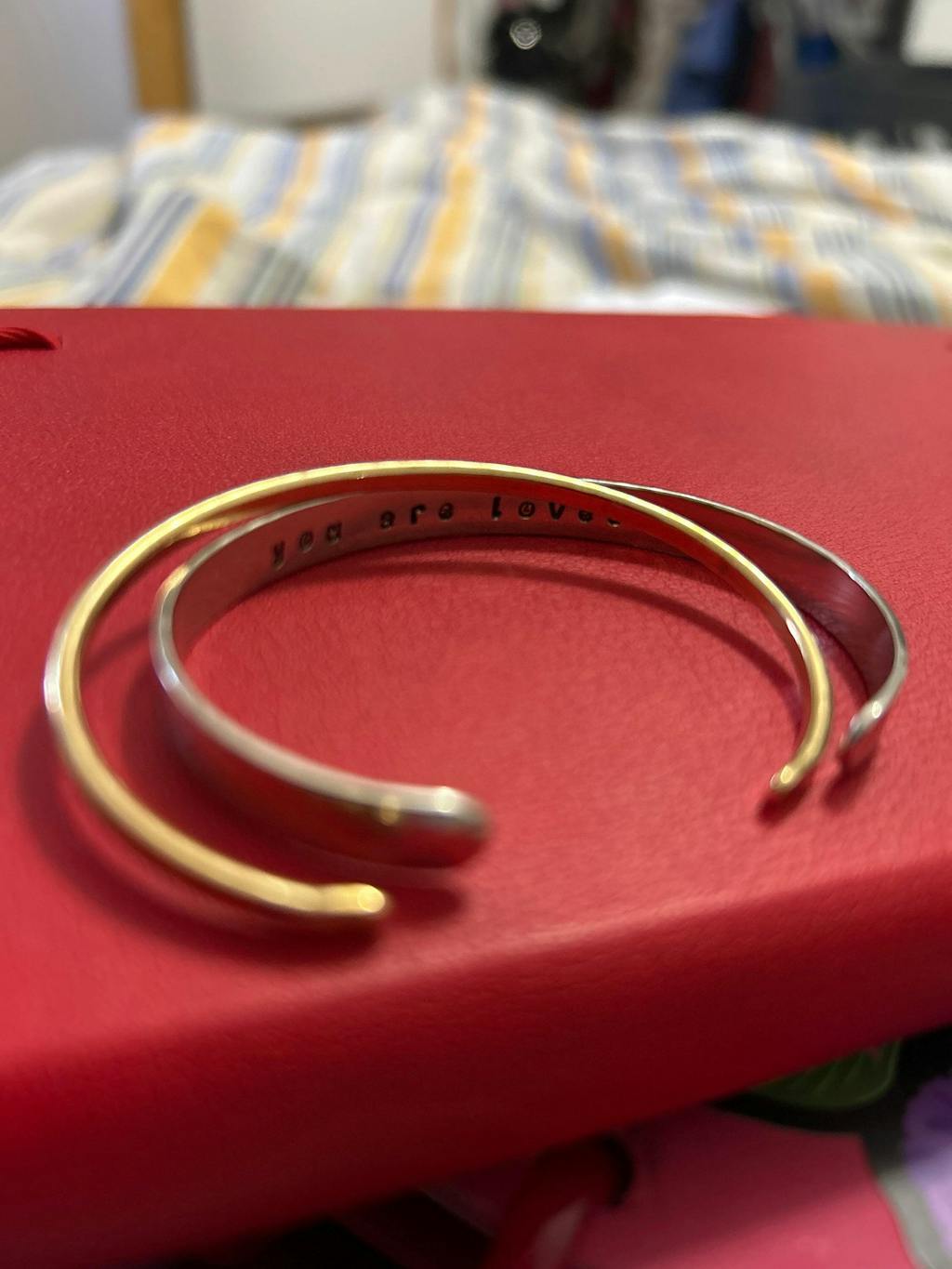 The timeless expression of 'You are loved' is thoughtfully hand cast into the center of a 1/4” slim cuff, allowing the message to rest gently against the skin. The outer surface of the cuff features a traditional hammered texture, enhancing its beauty. Accompanying the silver slim cuff is a 1/8” golden skinny cuff, mirroring the same texture.